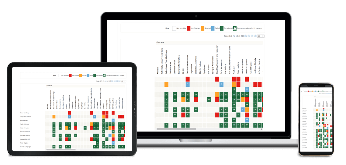 Our Learning Management System (LMS) provides an easy solution to overcoming your staff compliance training challenges. Our colour-coded training matrix gives you a complete overview of your staff training status, which automatically updates in real time. An excellent compliance tool that can be presented at an inspection.